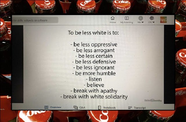 Ένας εργαζόμενος έχει διαρρεύσει στιγμιότυπα από ένα διαδικτυακό εκπαιδευτικό σεμινάριο το οποίο σύμφωνα με πληροφορίες αναγκάζονται να παρακολουθήσουν οι υπάλληλοι της Coca-Cola, λέγοντας ότι πρέπει να «προσπαθήσουν να είναι λιγότερο λευκοί», σύμφωνα με τον Δρ. Karlyn Borysenko.