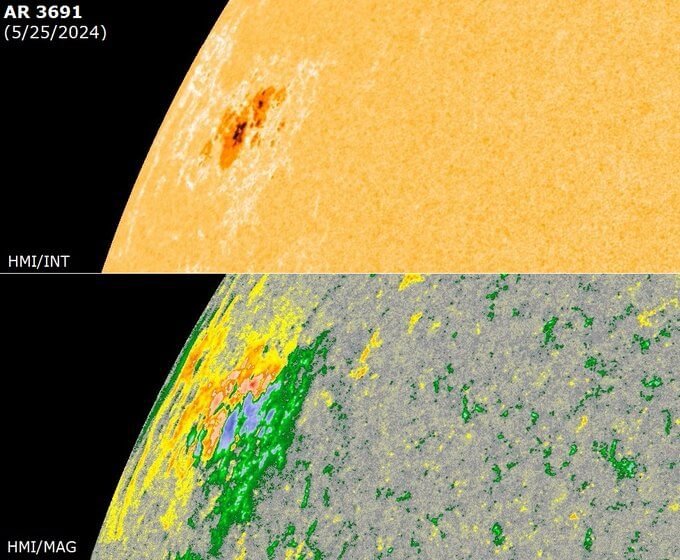 Το Sunspot AR3691 είναι ένας παλιός μας φίλος, που αναδύεται μετά από ένα ταξίδι δύο εβδομάδων γύρω από την μακρινή πλευρά του Ήλιου. Η ηλιακή κηλίδα, παλαιότερα γνωστή ως AR3663, προκάλεσε πέντε ηλιακές εκλάμψεις κατηγορίας Χ στις αρχές Μαΐου.