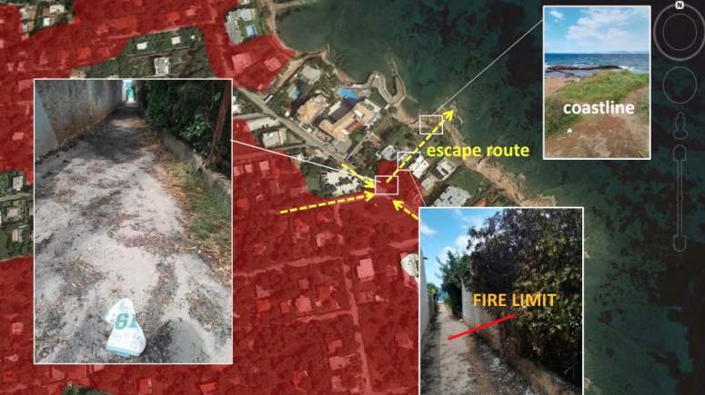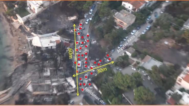 Ακόμη επισημαίνεται η διαπίστωση για τις ανύπαρκτες διόδους εξόδου προς τη θάλασσα, με αποτέλεσμα οι πολίτες να εγκλωβιστούν και να βρουν φρικτό θάνατο. Διαπίστωση που αποτυπώνεται και στα 35 εγκαταλειμμένα σε συμφόρηση και σε πολύ μικρό χώρο, καμένα αυτοκίνητα.