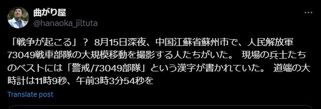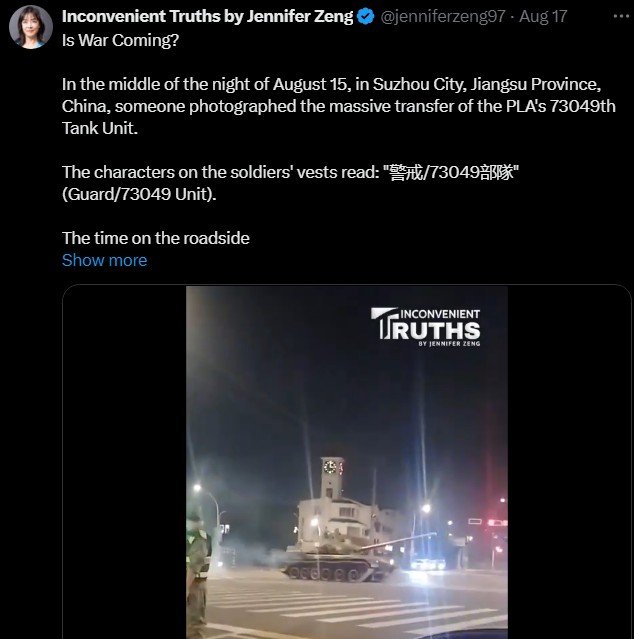 Πριν από λίγες μέρες, ένα βίντεο εμφανίστηκε στα κινεζικά κοινωνικά δίκτυα που απαθανάτιζε την κίνηση μιας συνοδείας τεθωρακισμένων οχημάτων στην πόλη Suzhou της επαρχίας Jiangsu της Κίνας. Στις 17 Αυγούστου, ο @jenniferzeng97 το αναδημοσίευσε και σήμερα έφτασε ήδη στην Αμερική, όπου οι βιντεομπλόγκερ κρούουν τον κώδωνα του κινδύνου και φωνάζουν για τα χιλιάδες τανκς που έχει αρχίσει να κινεί η Κίνα: