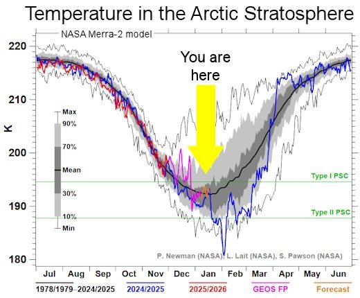 spaceweather: Η ΑΡΚΤΙΚΗ ΣΤΡΑΤΟΣΦΑΙΡΑ ΚΡΥΩΝΕΙ: Πολύ κρύο. Τα κλιματικά μοντέλα της NASA αναφέρουν ότι η τρέχουσα θερμοκρασία είναι -80°C, τυπική των χειμερινών μηνών εντός του Αρκτικού Κύκλου. Αυτό σημαίνει ότι τώρα είναι αρκετά κρύο για τα Πολικά Στρατοσφαιρικά Νέφη (PSCs) Τύπου Ι: