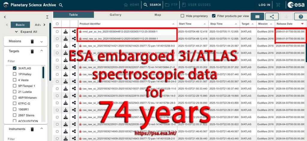 Ορισμένα δεδομένα της NASA/ESA για τον 3I/ATLAS είναι απόρρητα για 74 χρόνια, ενώ τα πιο δημόσια διαθέσιμα δεδομένα είναι απόρρητα μέχρι τις 3 Απριλίου 2026.