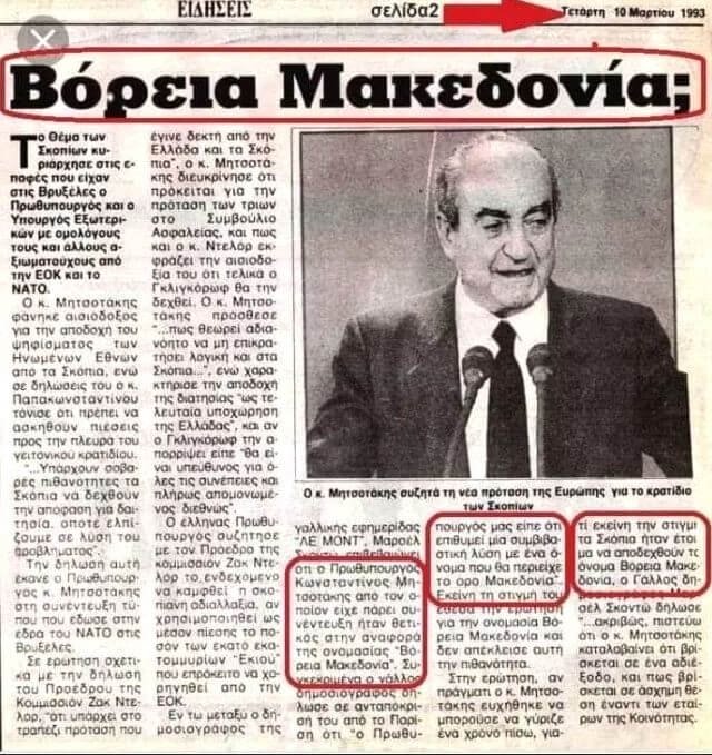 Κωνστ.Μητσοτάκης σε Παπαχελά,τ.Β’,1992, σ.244: “να κλείσουμε θέμα με το όνομα Βόρεια Μακεδονία”, σ.249: “να δεχτούμε μια λύση ονομασίας όπως Βόρεια Μακεδονία”,σ.250: “θα δεχόμουν το Βόρεια Μακεδονία”.Αυτά 27 χρόνια πριν. Η ΝΔ χαρακτήρισε αυτό το όνομα σε Πρεσπες ως προδοσία!