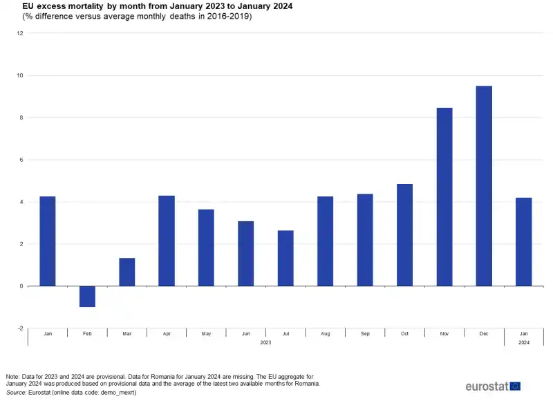 Υπερβολική θνησιμότητα σημειώθηκε και στην ΕΕ τον Ιανουάριο του τρέχοντος έτους, σύμφωνα με νέα στοιχεία της ευρωπαϊκής στατιστικής υπηρεσίας Eurostat. Ωστόσο, το υπερβολικό ποσοστό θνησιμότητας έχει μειωθεί ελαφρώς, από 9,5 τοις εκατό τον Δεκέμβριο σε 4,2 τοις εκατό τον Ιανουάριο, αναφέρει το Uncutnews.