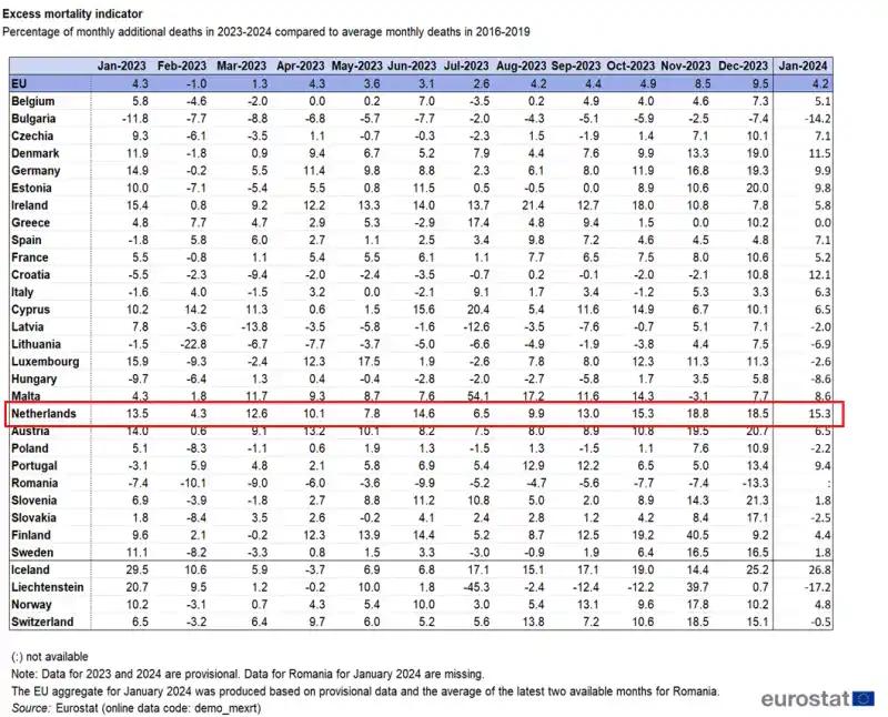 Αυτό που προκαλεί αμέσως εντύπωση είναι ότι η Ολλανδία έχει το υψηλότερο ποσοστό υπερβολικής θνησιμότητας στην Ευρωπαϊκή Ένωση. Τον Ιανουάριο, το υπερβολικό ποσοστό θνησιμότητας δεν ήταν μικρότερο από 15,3 τοις εκατό. Η Κροατία (12,1 τοις εκατό) και η Δανία (11,5 τοις εκατό) έχουν επίσης υψηλό ποσοστό θνησιμότητας.