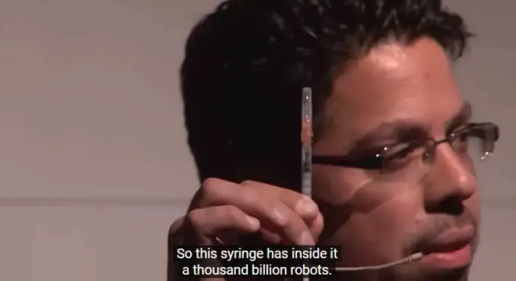 Στο βίντεο εξηγεί ότι μια σύριγγα μπορεί να περιέχει «χίλια δισεκατομμύρια ρομπότ».