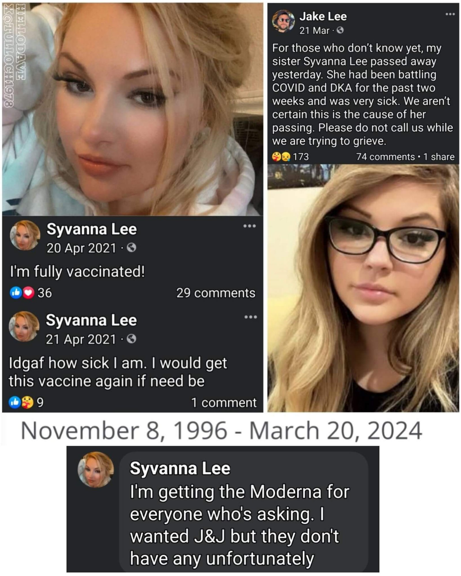 – Η Syvanna Lee 27 ετών στις 20/4/21 ήταν φουλ εμφολιασμένη, γιατί υπάκουσε την Υποχρεωτική Υγεία, όλα ήταν για την ανοσία της, και τους πίστεψε!!!