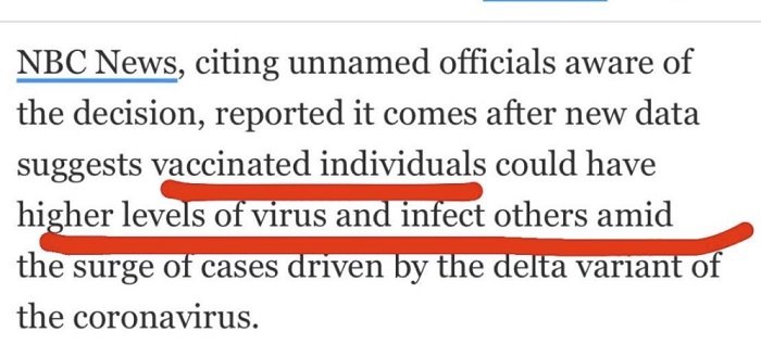 «Το NBC News, επικαλούμενο ανώνυμους αξιωματούχους που γνώριζαν την απόφαση, ανέφερε ότι νέα δεδομένα υποδηλώνουν ότι τα εμβολιασμένα άτομα θα μπορούσαν να έχουν υψηλότερα επίπεδα ιού και να μολύνουν άλλα άτομα. Που προκαλούνται από την μετάλλαξη δέλτα», ανέφερε το USA Today σε ένα απόσπασμα που αργότερα διαγράφηκε από ένα άρθρο.