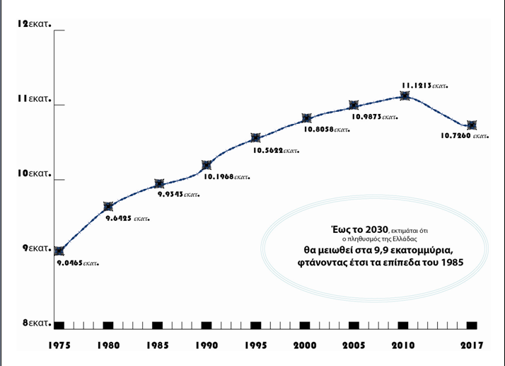 Αφότου ξέσπασε η οικονομική κρίση, ο συνολικός πληθυσμός άρχισε να μειώνεται, κυρίως λόγω της μετανάστευσης νέων στο εξωτερικό για σπουδές και εργασία, αλλά και της δεδομένης υπογεννητικότητας. Μεταξύ 2011 και 2016 η Ελλάδα έχασε σχεδόν το 3% του πληθυσμού της ενώ εκτιμάται ότι από 10,7 εκατομμύρια το 2017, ο πληθυσμός της χώρας μας θα μειωθεί στα 9,9 εκατομμύρια έως το 2030 και στα 8,9 εκατομμύρια έως το 2050, με συνέπεια η πρόσθετη μείωση να φτάσει το 18%.