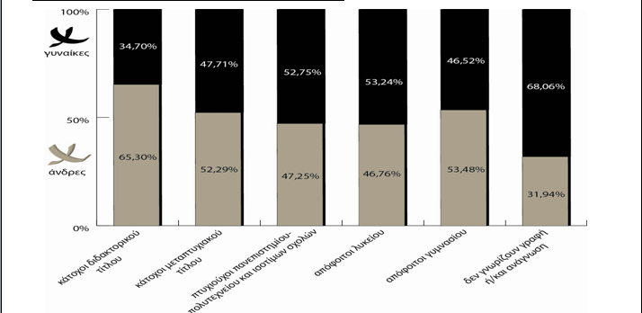Σε σχέση με το μορφωτικό επίπεδο, βλ. Γράφημα 6, παρατηρούμε ιδιαίτερα αυξημένο ποσοστό αναλφάβητων γυναικών (πάνω από τα 2/3 του αναλφάβητου πληθυσμού), καθώς και υπο-εκπροσώπηση των γυναικών στο ανώτερο μορφωτικό επίπεδο (κατοχή διδακτορικού τίτλου).