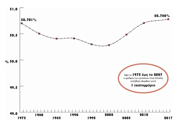 Η Ελλάδα είναι μια από τις χώρες όπου οι γυναίκες αποτελούν την πλειονότητα του πληθυσμού. Μάλιστα, το ποσοστό του γυναικείου πληθυσμού έχει ελαφρώς αυξηθεί από 50.701% το 1975 σε 50.780% το 2017 (Γράφημα 2). Η πορεία που ακολούθησε το ποσοστό του γυναικείου πληθυσμού στην Ελλάδα ήταν πτωτική έως το 1998 και έκτοτε αυξάνεται (ωστόσο, από το 2010 με χαμηλότερο ρυθμό).