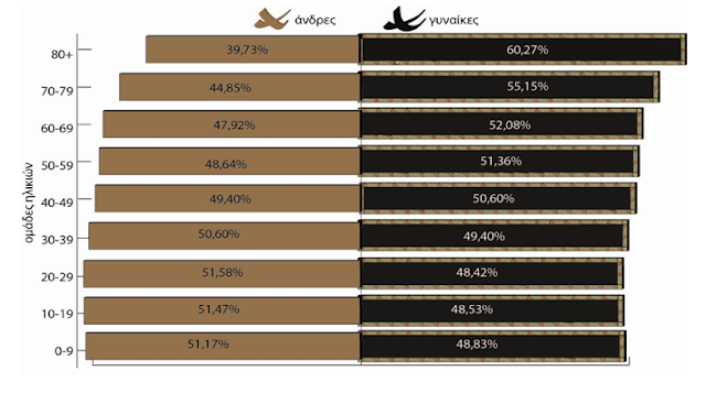 Ο υπέργηρος αυτός πληθυσμός στην πλειονότητά του αποτελείται από γυναίκες. Παρακολουθώντας την κατανομή του πληθυσμού ανά φύλο και ηλικιακή ομάδα στην τελευταία απογραφή της ΕΛΣΤΑΤ (2011), όπως φαίνεται στο Γράφημα 5, παρατηρούμε ότι από την ηλικιακή ομάδα των 20-29, το ποσοστό του γυναικείου πληθυσμού ακολουθεί αυξητική πορεία, υπερτερώντας ήδη των αντρών στις ηλικίες 40-49, φθάνοντας το συντριπτικό 60,27% στην ηλικιακή ομάδα άνω των 80 ετών.