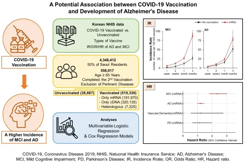 Ο Δρ Komano επεσήμανε μια σειρά από ανησυχητικά ευρήματα: πρώτον, έδειξε ότι η επίπτωση της ήπιας γνωστικής εξασθένησης (MCI), ενός πρώιμου σταδίου άνοιας, ήταν υπερδιπλάσια μεταξύ εκείνων που είχαν εμβολιαστεί σε σύγκριση με αυτούς που δεν είχαν εμβολιαστεί. εμβολιασμένα. Επιπλέον, ο αριθμός των εμβολιασμένων ατόμων που ανέπτυξαν άνοια, συμπεριλαμβανομένης της νόσου Αλτσχάιμερ, εντός τριών μηνών από τον εμβολιασμό ήταν περισσότερο από 20% υψηλότερος από ό,τι μεταξύ των μη εμβολιασμένων.