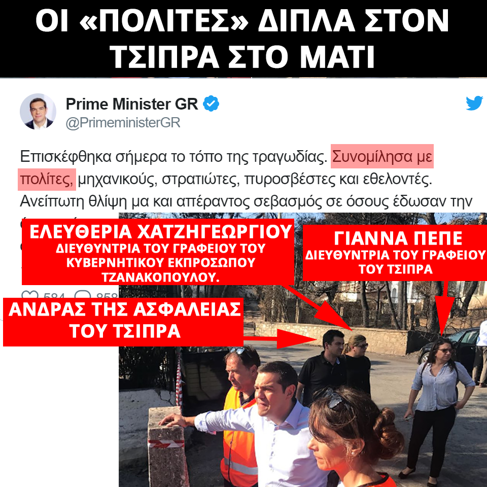 Στην ανακοίνωσή του, μετά από την… καταδρομική επίσκεψη στον τόπο της εθνικής τραγωδίας, ο mister Tsipras έγραψε πως συνάντησε εκεί και πολίτες.