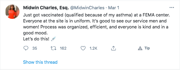 Η κα Charles δημοσίευσε την μοντέρνα ανακοίνωση «εμβολιάζομαι» στο Twitter την 1η Μαρτίου.