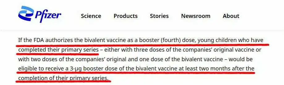 Εάν ο FDA επιτρέπει το δισθενές εμβόλιο ως αναμνηστική (τέταρτη) δόση, μικρά παιδιά που έχουν ολοκληρώσει την αρχική τους σειρά – είτε με τρεις δόσεις από το αρχικό εμβόλιο της εταιρείας είτε με δύο δόσεις από το αρχικό εμβόλιο της εταιρείας και μία δόση από το δισθενές εμβόλιο – είναι κατάλληλοι να λάβουν αναμνηστική δόση 3 μg του δισθενούς εμβολίου τουλάχιστον δύο μήνες μετά την ολοκλήρωση της αρχικής σειράς τους.