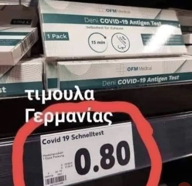 Παράνοια και διαστροφή, μια κοινωνία του μίσους και του σαδισμού σας έχει διαλύσει την νόηση την υγεία και το πορτοφόλι… Το καλό όμως να λέγετε! Καλές οι τιμές πάντα στην Γερμανία. 0.80 λεπτά το τεστ. Συμφέρει να ζεις σε μια χώρα που είναι το μεγαλύτερο παράδειγμα για τους άλλους! Τους βάζουν όλους σε τάξη και συμφέρει και η ζωή.