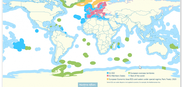Ένα έγγραφο της Ευρωπαϊκής Επιτροπής με τίτλο «The EU and international ocean governance»αναφέρει ότι η Ευρωπαϊκή Ένωση διαθέτει την μεγαλύτερη ΑΟΖ στον κόσμο και το μέγεθός της φτάνει τα 20 εκατ. τετραγωνικά χιλόμετρα, δηλαδή οι θάλασσές της είναι 380% μεγαλύτερες από την γη της.