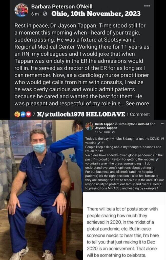 «Αναπαύσου εν ειρήνη, Δρ. Jayson Tappan. Ο χρόνος σταμάτησε για μια στιγμή σήμερα το πρωί όταν άκουσα για το τραγικό, ξαφνικό σου θάνατο. Πήρε μέρος στο Περιφερειακό Ιατρικό Κέντρο Spotsylvania. Δουλεύοντας εκεί για 11 χρόνια ως RN.”