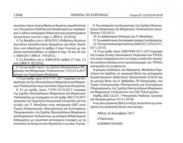 Η μόνιμη υπάλληλος του Ιδρύματος, Μπαζιάνα Περιστέρα του Αχιλλέα, σε οργανική θέση της κατηγορίας Εργαστηριακού Διδακτικού Προσωπικού (Ε.ΔΙ.Π) και σε μόνιμη θέση της Α ́ βαθμίδας, ΠΕ Κατηγορίας, του Τομέα «Επικοινωνιών, Ηλεκτρονικής και Συστημάτων Πληροφορικής» της Σχολής Ηλεκτρολόγων Μηχανικών και Μηχανικών Υπολογιστών του Ε.Μ. Πολυτεχνείου.