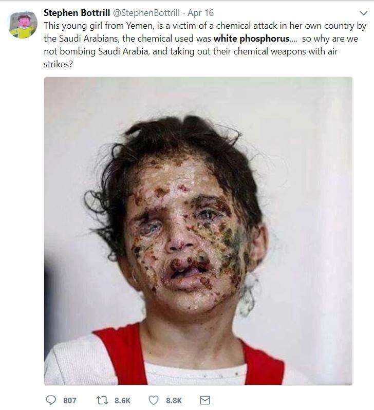 Αυτό το μικρό κοριτσάκι είναι θύμα από τις επιθέσεις της Σ. Αραβίας στην Υεμένη επάνω σε αμάχους. Η Σ. Αραβία χρησιμοποιεί Λευκό Φώσφορο εναντίον του ηρωικού λαού της Υεμένης επειδή αμύνονται κατά της εγκληματικής εισβολής των γειτόνων τους…