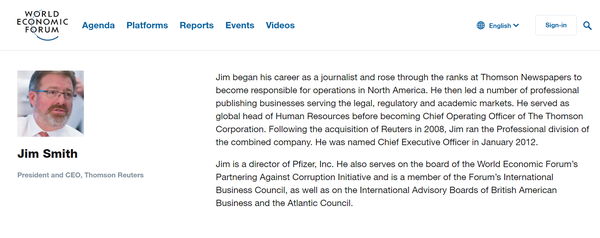 Δεν είναι τόσο περίεργο όταν ο Τζιμ Σμιθ, κορυφαίο μέλος στο Reuters, βρίσκεται επίσης στο διοικητικό συμβούλιο τόσο της Pfizer όσο και του Word Economic Forum.