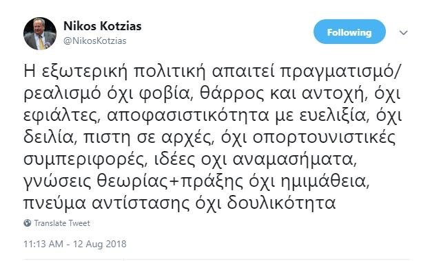 “Η εξωτερική πολιτική απαιτεί πραγματισμό/ρεαλισμό όχι φοβία, θάρρος και αντοχή, όχι εφιάλτες, αποφασιστικότητα με ευελιξία, όχι δειλία, πίστη σε αρχές, όχι οπορτουνιστικές συμπεριφορές, ιδέες όχι αναμασήματα, γνώσεις θεωρίας και πράξης όχι ημιμάθεια, πνεύμα αντίστασης όχι δουλικότητα” έγραψε ο κ. Κοτζιάς.