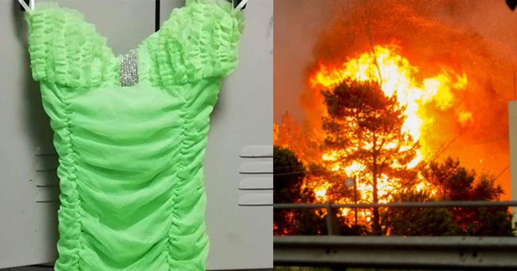 Ένα λαχανί φωσφορούχο φόρεμα από την εποχή της disco- προφανώς-, με τον απαραίτητο όπως φαίνεται λουσάτο στολισμό στο κέντρο, φαίνεται πως βρέθηκε μεταξύ των ρούχων που έχουν σταλεί στους πληγέντες στην Ανατολική Αττική.