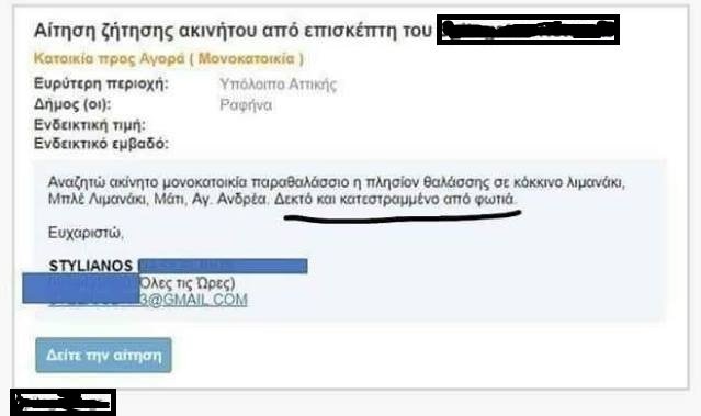 Στην αγγελία βλέπετε ένα αρπαχτικό να ζητά και τις καμμένες σανίδες του κατεστραμμένου σπιτιού από τις φλόγες…