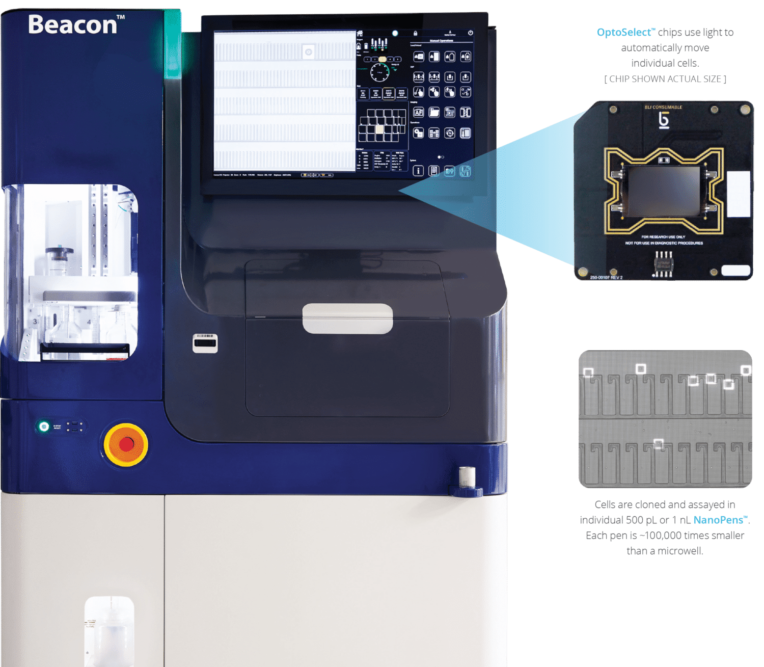 Το Beacon System καταγράφει το φωτεινό πεδίο (φωτός) και εικόνες φθορισμού από κάθε NanoPen ™ σε ένα τσιπ OptoSelect. Μπορεί να εντοπίσει και να δοκιμάσει το ίδιο μεμονωμένο κελί, και σε πολλαπλά χρονικά σημεία, για να αποκαλύψει σε βαθύ προφίλ – πλούσια λεπτομερή «δακτυλικά αποτυπώματα» κυττάρων και κλώνων, τα οποία δεν μπορουν να παραχθούν με άλλο τρόπο.