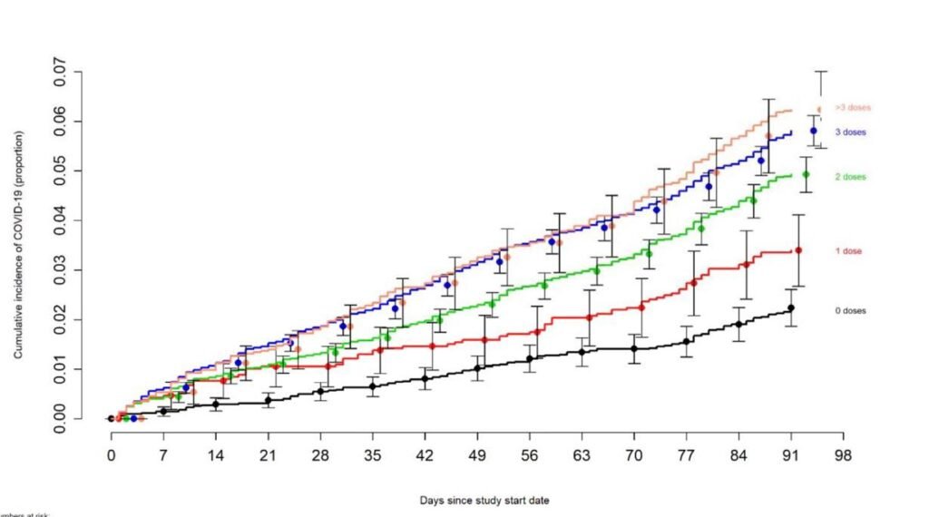 Το γράφημα, το οποίο ετοίμασαν οι συγγραφείς της μελέτης με βάση τα ευρήματά τους, δείχνει πώς κάθε πρόσθετη δόση εμβολίου αύξανε σημαντικά τον κίνδυνο προσβολής από τη νόσο Covid. Φυσικά, δεν μπορούμε να υποθέσουμε ότι τα αποτελέσματα της μελέτης θα δημοσιευτούν στα μέσα ενημέρωσης των χωρών του ΠΟΥ που χρηματοδοτούνται από την κυβέρνηση.