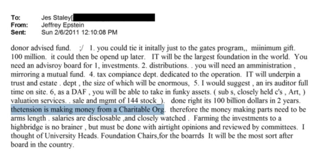 Στις ίδιες αλυσίδες email, ο Ji επισημαίνει αποσπάσματα στα οποία ο Epstein δηλώνει ρητά ότι η απόκτηση χρημάτων για ένα φιλανθρωπικό ίδρυμα δημιουργεί ένταση. Αυτά περιγράφουν ότι οι κερδοσκοπικές δραστηριότητες πρέπει να διατηρούνται σε απόσταση, έτσι ώστε τα εμπορικά έσοδα να παραμένουν νομικά ξεχωριστά από το φιλανθρωπικό ίδρυμα. Αυτό δείχνει ότι οι φιλανθρωπικές δομές χρησιμοποιήθηκαν για τη διευκόλυνση επενδύσεων που θα μπορούσαν να αποφέρουν κέρδη, λέει ο Ji.