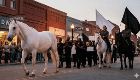 Τότε, κάπου στο βάθος, εμφανίστηκαν δύο αναβάτες – ένας μαύρος, ένας λευκός. Άρχισαν να προχωρούν, ανοίγοντας δρόμο μέσα από τις σειρές των ανθρώπων που ακολουθούσαν το άσπρο άλογο.
