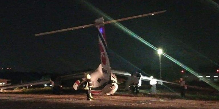 Στις φωτογραφίες που κυκλοφόρησαν στα social media εμφανίζεται το αεροσκάφος, εκτός διαδρόμου, που σύμφωνα με το RT κόπηκε σε τρία κομμάτια.
