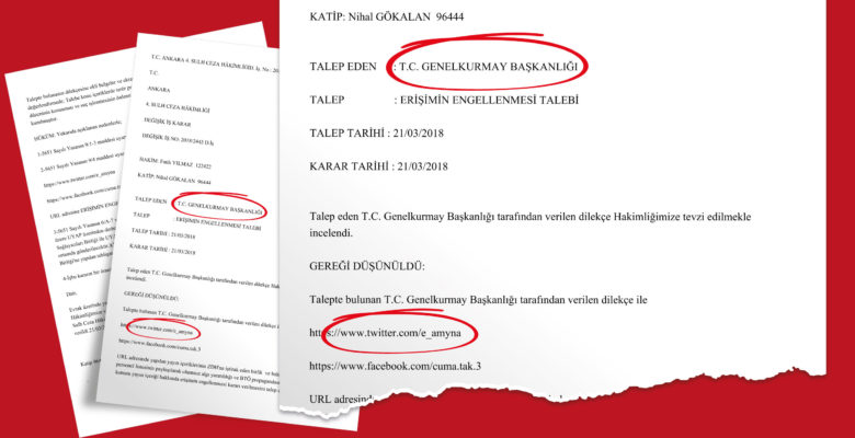 Συγκεκριμένα, στις 21 Μαρτίου 2018 υποβλήθηκε στο δικαστήριο αίτημα του τουρκικού Γενικού Επιτελείου και αυθημερόν εκδόθηκε η υπ΄ αριθμ. 2018/2443 απόφαση του 4ου Πρωτοβάθμιου Δικαστηρίου της Άγκυρας, στην οποία διατυπώνεται ο ανυπόστατος ισχυρισμός περί «δυσφήμησης» του τουρκικού στρατιωτικού προσωπικού που σκοτώθηκε κατά τη διάρκεια της παράνομης εισβολής στην Συρία και «υποστήριξης της προπαγάνδας της Διαμελιστικής Τρομοκρατικής Οργάνωσης» (στο κείμενο: ΒΤÖ: Βölücü Terör Örgütü) από τον λογαριασμό της e-Amyna στο Twitter καθώς και από έτερο λογαριασμό στο Facebook.