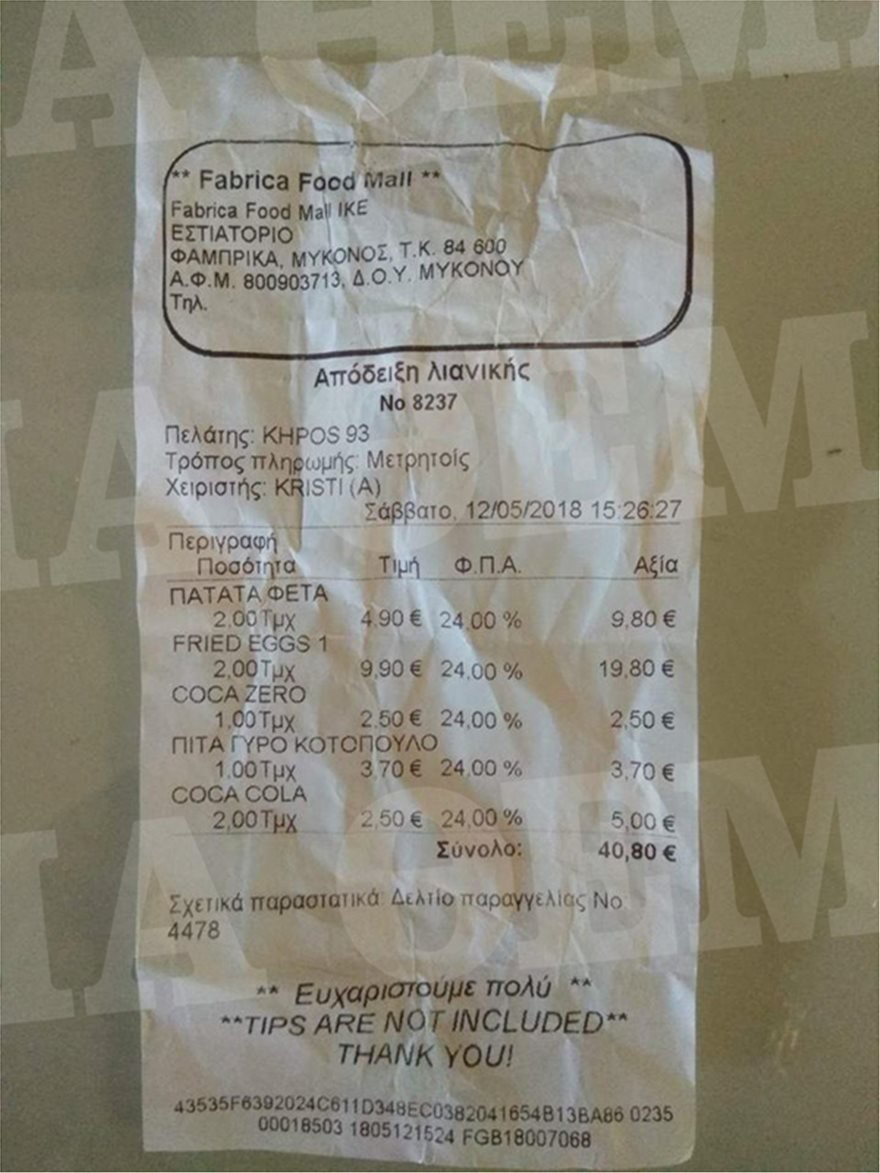 Η Μύκονος ανακηρύσσεται ως το νησί με τα πιο ακριβά τηγανητά αυγά αφού κανείς δεν μπορεί να διαψεύσει τα όσα αναγράφονται στην απόδειξη της ταμειακής μηχανής, την οποία φέρνει στο φως το protothema.gr
