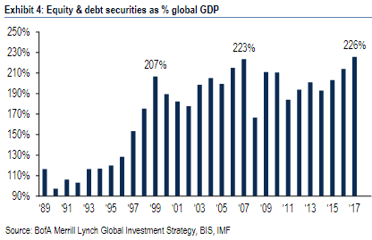 Υπενθυμίζουμε πως η χρηματιστηριακή αξία των μετοχών ήταν μόλις στα 30 τρις $ το 2009, έχοντας έκτοτε σχεδόν τριπλασιαστεί – ενώ όταν το σύνολο της αξίας μετοχών και ομολόγων υπερέβαινε στο παρελθόν το προηγούμενο ρεκόρ του, τότε καταλήγαμε σε ένα νέο κραχ. Αυτό ακριβώς συνέβη το 1999 και το 2007 – με την μεγάλη διαφορά όμως ότι, για πρώτη φορά έχουν επέμβει όλες οι μεγάλες κεντρικές τράπεζες, στηρίζοντας τα χρηματιστήρια με τις τεράστιες ποσότητες ρευστότητας, με τις οποίες τα έχουν πλημμυρίσει.