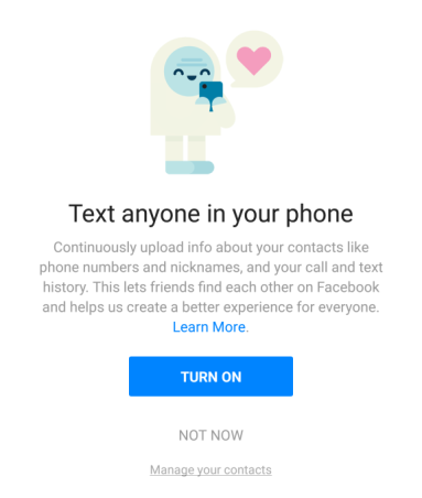 Εξήγησε δε ότι το Facebook χρησιμοποιεί τις επαφές των χρηστών του ως μέρος του αλγόριθμού του για να προτείνει νέους φίλους, αλλά και για την καλύτερη αξιοποίηση του Messenger.