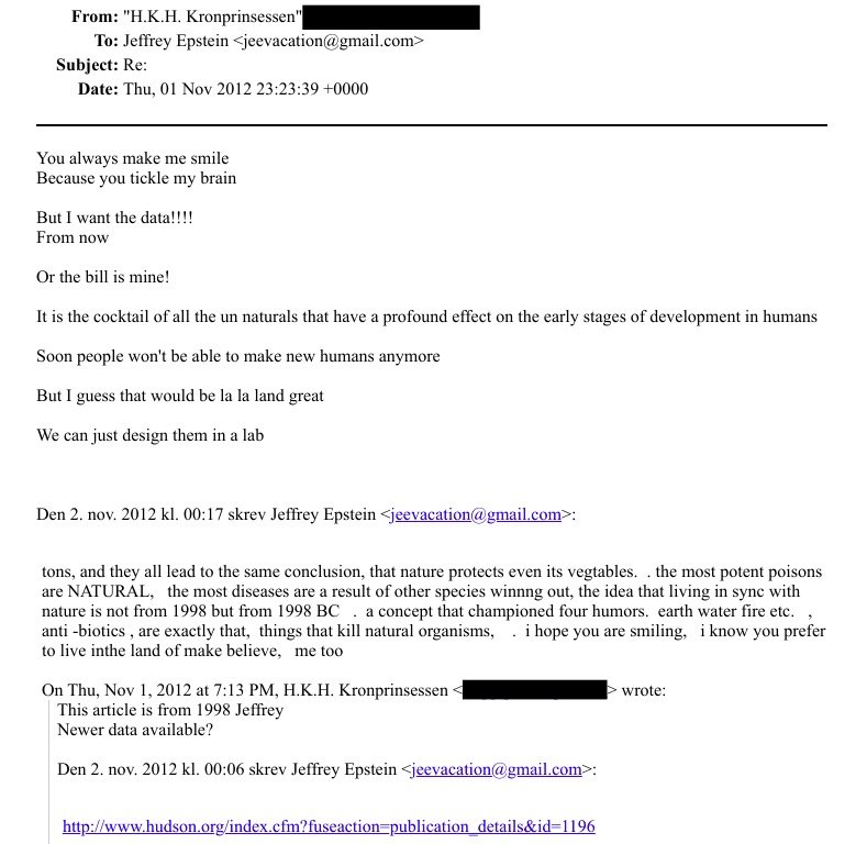 Η Πριγκίπισσα έκανε μια ακόμη εντυπωσιακή δήλωση στα email. Την 1η Νοεμβρίου 2012, έγραψε: «Σύντομα, οι άνθρωποι δεν θα μπορούν να κάνουν παιδιά».