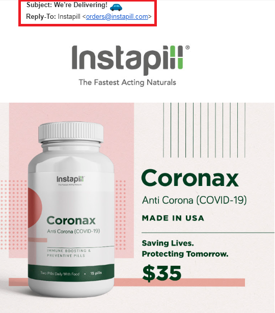 Στα προϊόντα που διαφημίζονται στο email που λαμβάνουν πολίτες των ΗΠΑ στα ηλεκτρονικά τους ταχυδρομεία από την Instapill ξεχωρίζουν τα χάπια “Coronax”. Αυτά παρουσιάζονται ως το καταλληλότερο φάρμακο που καταπολεμά στοχευμένα τον Covid-19 και σώζει ζωές.