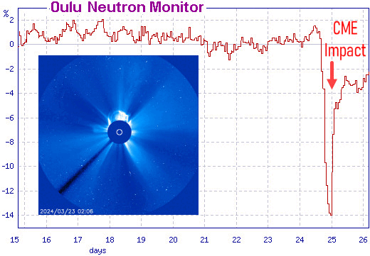 Η πτώση του Forbush αυτής της εβδομάδας είναι η μεγαλύτερη του ηλιακού κύκλου 25 (μέχρι στιγμής), ξεπερνώντας το προηγούμενο ρεκόρ που καταγράφηκε στις 3-4 Νοεμβρίου 2021, όταν ένας ισχυρός κανίβαλος CME μείωσε τον αριθμό νετρονίων κατά 11%.