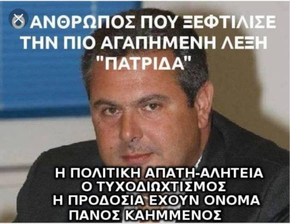 Προκαλεί με κάθε τρόπο την ελληνική κοινωνία ο συνοδοιπόρος Καμμένος, ο οποίος έδωσε στον Τσίπρα το στυλό για να υπογράψει την προδοσία της Μακεδονίας μας.