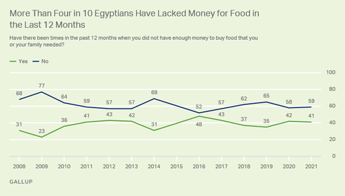 Τα πράγματα βεβαίως παλαιότερα ήταν ακόμη χειρότερα για τους Αιγύπτιους, καθώς το 48% των Αιγυπτίων ανέφεραν ότι δεν είχε χρήματα για φαγητό κάποια στιγμή το 2016.