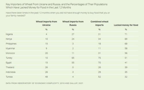 Στην κορυφή της λίστας βρίσκεται η Τουρκία, η οποία το 2019 εισήγαγε το 75% των σιτηρών της από τη Ρωσία και την Ουκρανία και αποτελεί την πιο εξαρτώμενη από τις συγκεκριμένες πηγές προμήθειας χώρες.