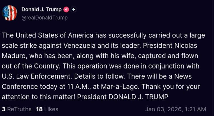 Σύμφωνα με τις τελευταίες πληροφορίες από τον Λευκό Οίκο, ο Ντόναλντ Φρέντερικ κατέλαβε το Καράκας όχι σε τρεις ημέρες, αλλά σε περίπου τρεις ώρες, και θα κάνει επίσημη ανακοίνωση σχετικά με αυτό στις 11 π.μ. τοπική ώρα, οπότε παρακολουθούμε τις εξελίξεις.