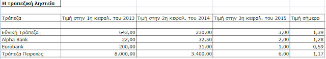 Όπως καταλαβαίνουμε, πρώτα οι μέτοχοι της Πειραιώς και μετά της Εθνικής Τράπεζας καταληστεύθηκαν – αφού εάν είχε τοποθετήσει κανείς 8.000 € στην Πειραιώς το 2013, σήμερα θα εισέπραττε 1,17 € (εξαιρετικός κύριος ο τότε επικεφαλής της, ο κ. Σάλλας, ο οποίος διαθέτει πολυτελέστατο σκάφος, συμμετοχή σε τράπεζα της Κρήτης μέσω επενδυτικής εταιρείας κοκ. εις υγείαν των κορόιδων – υπενθυμίζοντας την επιβάρυνση του δημοσίου με την «bad bank» της ΑΤΕ που εξαγόρασε η Πειραιώς, στην οποία είναι υποθηκευμένα εκατοντάδες χιλιάδες στρέμματα αγροτικής γης), ενώ για τα 643 € στην Εθνική 1,39 € (για τις υπόλοιπες ισχύει η ίδια λογική).