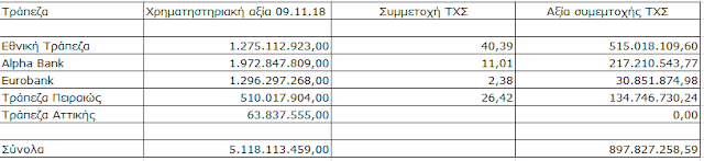 Υπενθυμίζουμε πως το δημόσιο, το ΤΧΣ εν προκειμένω, απαγορεύθηκε να συμμετέχει στην αύξηση των κεφαλαίων των τραπεζών του 2014 και του 2015 – οπότε τιμές των μετοχών του εξαϋλώθηκαν, πόσο μάλλον όταν η τρίτη κεφαλαιοποίηση του 2015 έγινε σε τιμές που αντιστοιχούσαν σε αποτίμηση μόλις 750 εκ. € για ολόκληρο το τραπεζικό σύστημα (από 33 δις € τον Ιούνιο του 2014), με πάγια περιουσιακά στοιχεία άνω των 300 δις €!