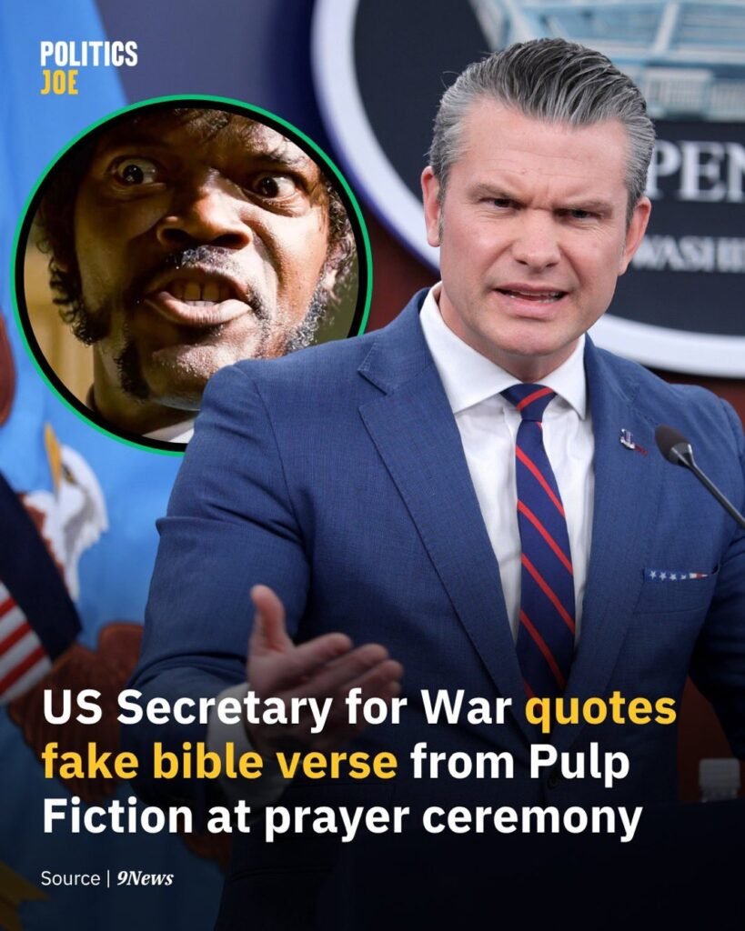 Ο υπουργός ΠΟΛΕΜΟΥ διαβάζει εδάφιο από ταινία του Ταραντίνο Pulp Fiction που υποθετικά θα ήταν από την Βίβλο αλλά όπως γνωρίζετε ΟΛΑ είναι ΑΝΑΠΟΔΑ στον σατανισμό. Αυτοι που έχουν δει την σκηνή της ταινίας γνωρίζουν ότι αναφέρεται σε εδάφιο μαϊμού από την Βίβλο, δηλαδή παπαριές του Ταραντίνο, ο ηθοποιός μόλις τελειώσει τους πυροβολεί όλους στο κεφάλι για να τους στείλει στην σελήνη. Στο αφεντικό του υπουργού ΠΟΛΕΜΟΥ και του Ταραντίνο που μάλλον είναι Εβραίος για να φτιάξει μια τόσο ανώμαλη ταινία όπου δολοφονούνται άνθρωποι και άλλοι βιάζονται.