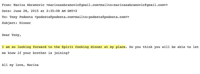Το όνομα της Αμπράμοβιτς, η οποία ασχολείται με την «τέχνη της ζωγραφικής», εμφανίστηκε σε έγγραφο του WikiLeaks για το «Μαγείρεμα με πνεύματα». Το 2015, κάλεσε τον Τζον Ποντέστα, τότε διευθυντή της εκστρατείας της Χίλαρι Κλίντον, και τον αδερφό του σε ένα «Δείπνο μαγειρικής με πνεύμα», ένα αποκρυφιστικό τελετουργικό που επινόησε ο σατανιστής Άλιστερ Κρόουλι.