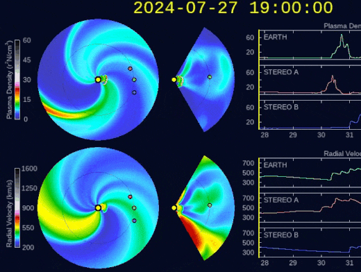Το μοντέλο δείχνει τέσσερις CME να συγχωνεύονται για να σχηματίσουν ένα ενιαίο μέτωπο καταιγίδας. Σχηματίστηκε στις 27 Ιουλίου, όταν δύο CME σε κοντινή απόσταση εκτινάχτηκαν από τον Ήλιο και αμέσως ενώθηκαν. Έτσι «αγριεμένοι» κατευθύνθηκαν προς τη Γη, σαρώνοντας τον ηλιακό άνεμο μπροστά τους.